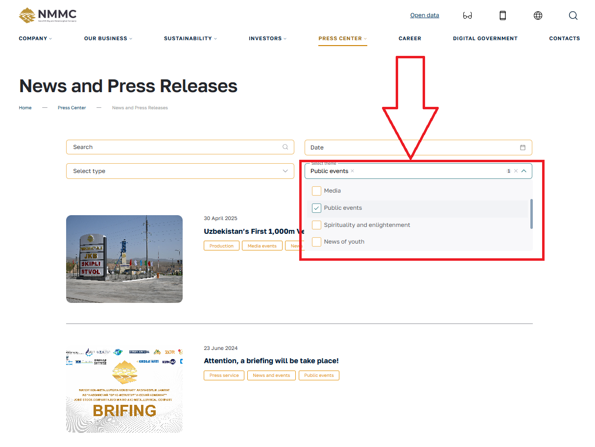Information about public events is available on the official website of NMMC www.ngmk.uz in the "News and Press Releases" subdivision of the "Press Service" section. To do this, you need to select "Public Events" in the "Select theme" subsection of the "News and Press Releases" section.