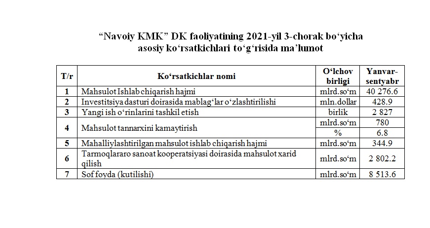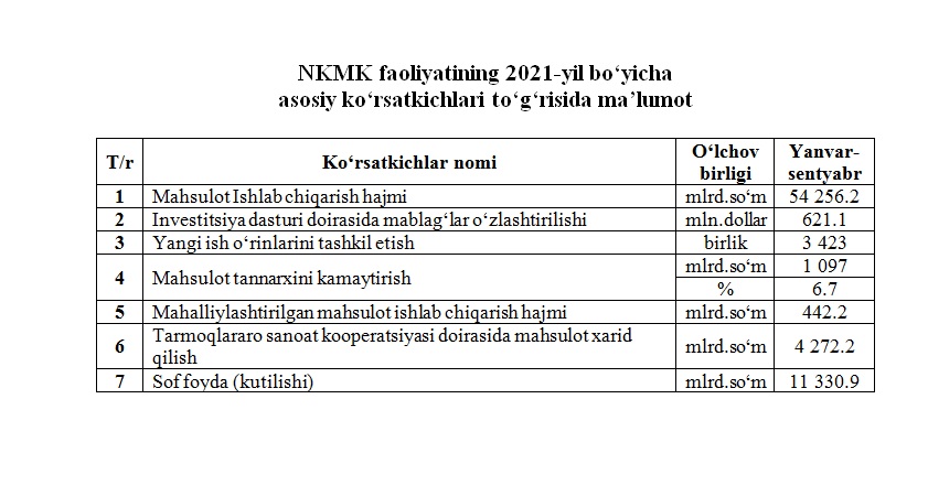 2021-yil 3-chorak bo‘yicha asosiy ko‘rsatkichlar to‘g‘risida maʼlumot