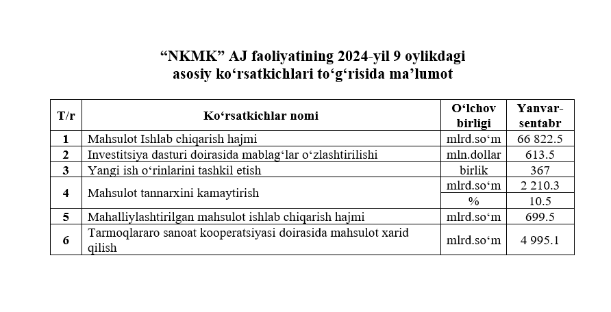 2024-yil 9 oylikdagi asosiy ko‘rsatkichlar to‘g‘risida maʼlumot